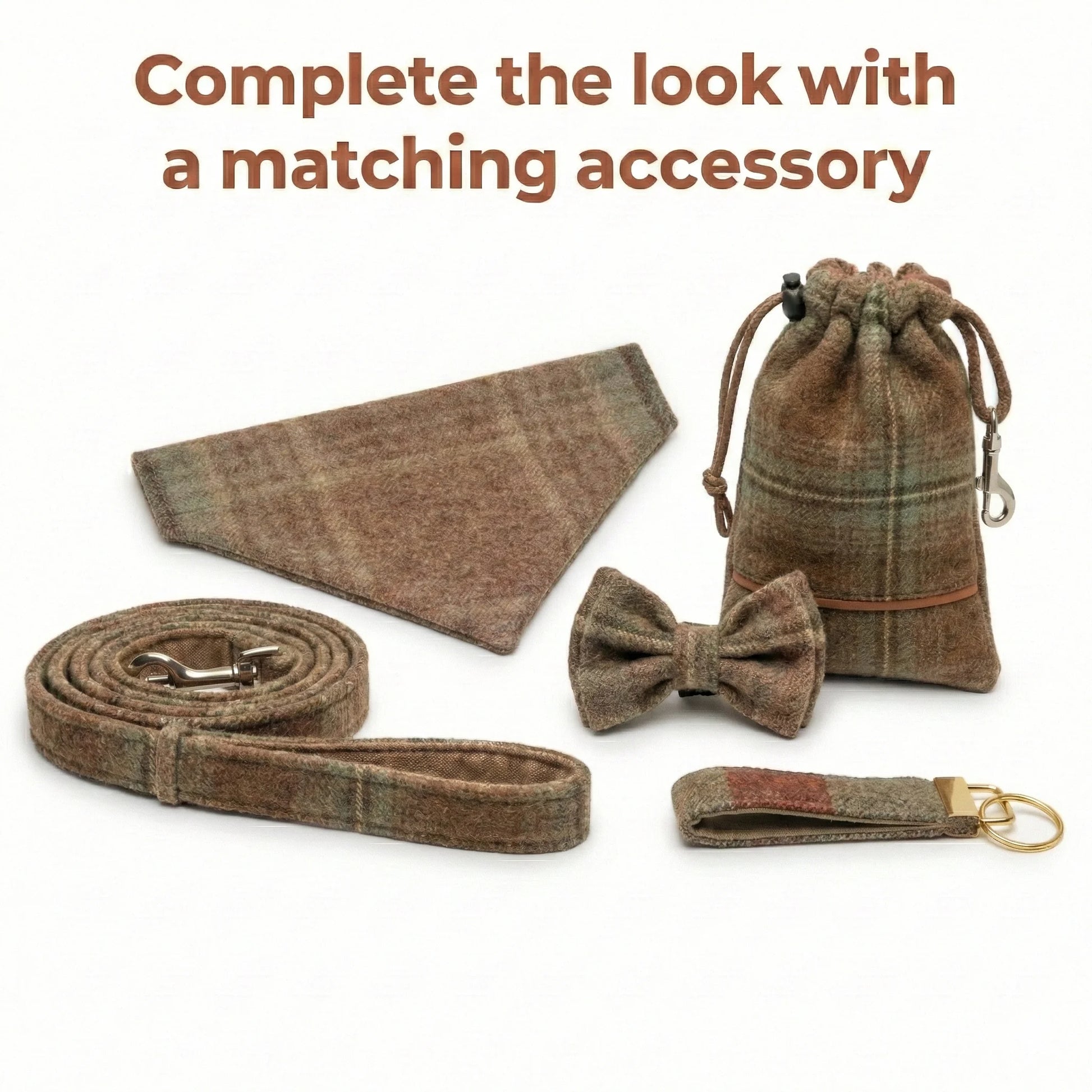 Absolutely! We offer matching tweed leads, bow ties, bandanas, headbands, keyrings, and treat bags to complete the look. Perfect for gifting or simply spoiling your dog in style.