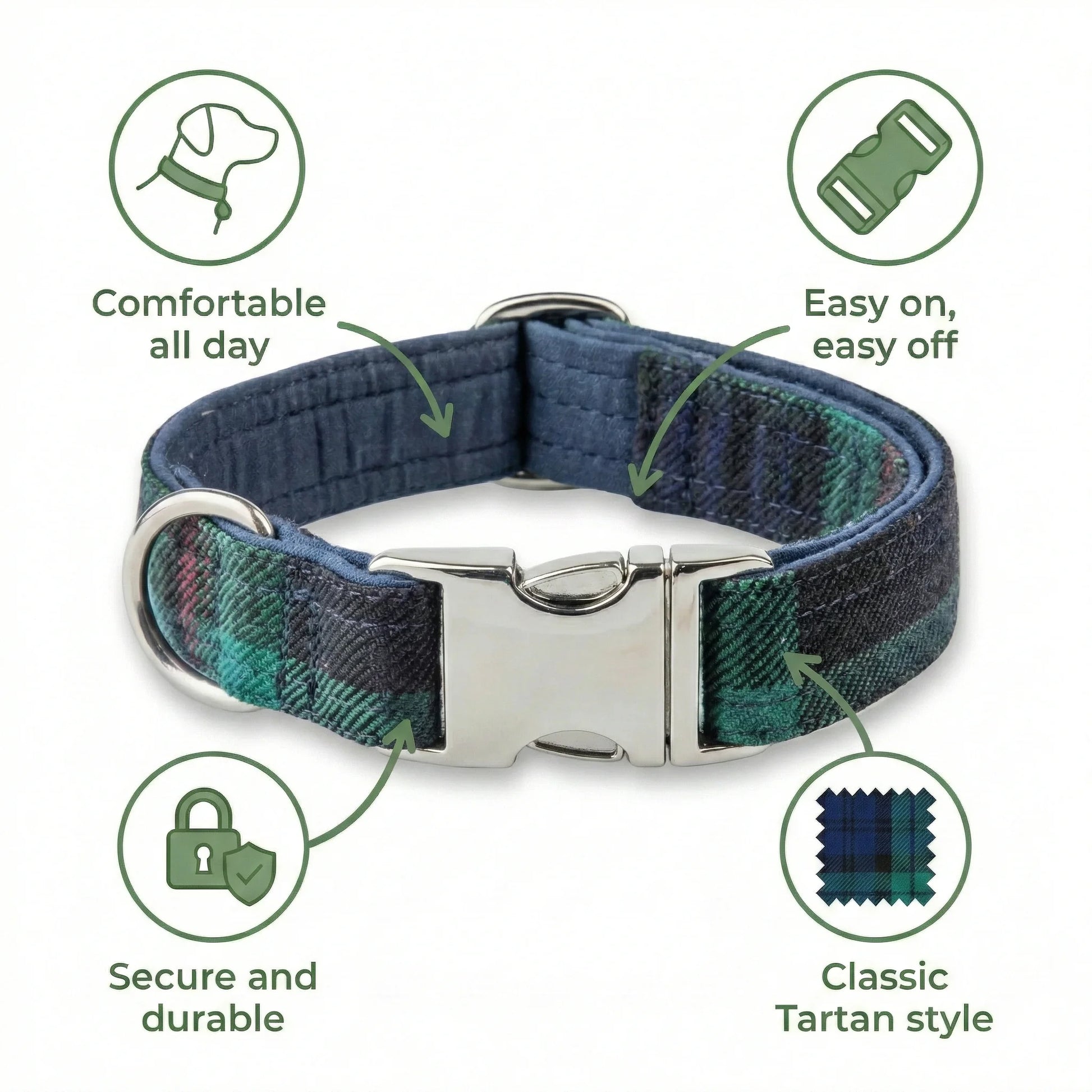 The Baird Modern Tartan wool clasp collar brings together Scottish heritage fabric and UK craftsmanship. A smart, practical choice for dogs who appreciate both comfort and timeless style.