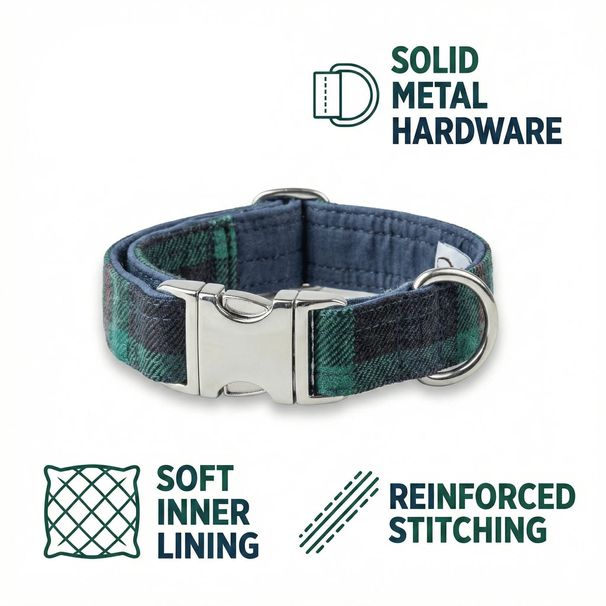 The most comfortable dog collars are made from soft, breathable materials that sit gently against the skin. Natural fibres like 100% wool (such as Harris Tweed and Abraham Moon wool) offer warmth, softness, and flexibility — especially when paired with a cotton lining, like our Kona non-irritable fabric. This combination is ideal for sensitive dogs and all-day wear. Padded collars or those with a fabric lining over a strong webbing core strike the best balance of comfort and durability.
