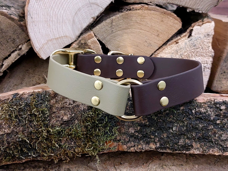 A waterproof Biothane buckle collar in timeless dark brown and beige. Strong, stylish, and built for dogs who love the outdoors.