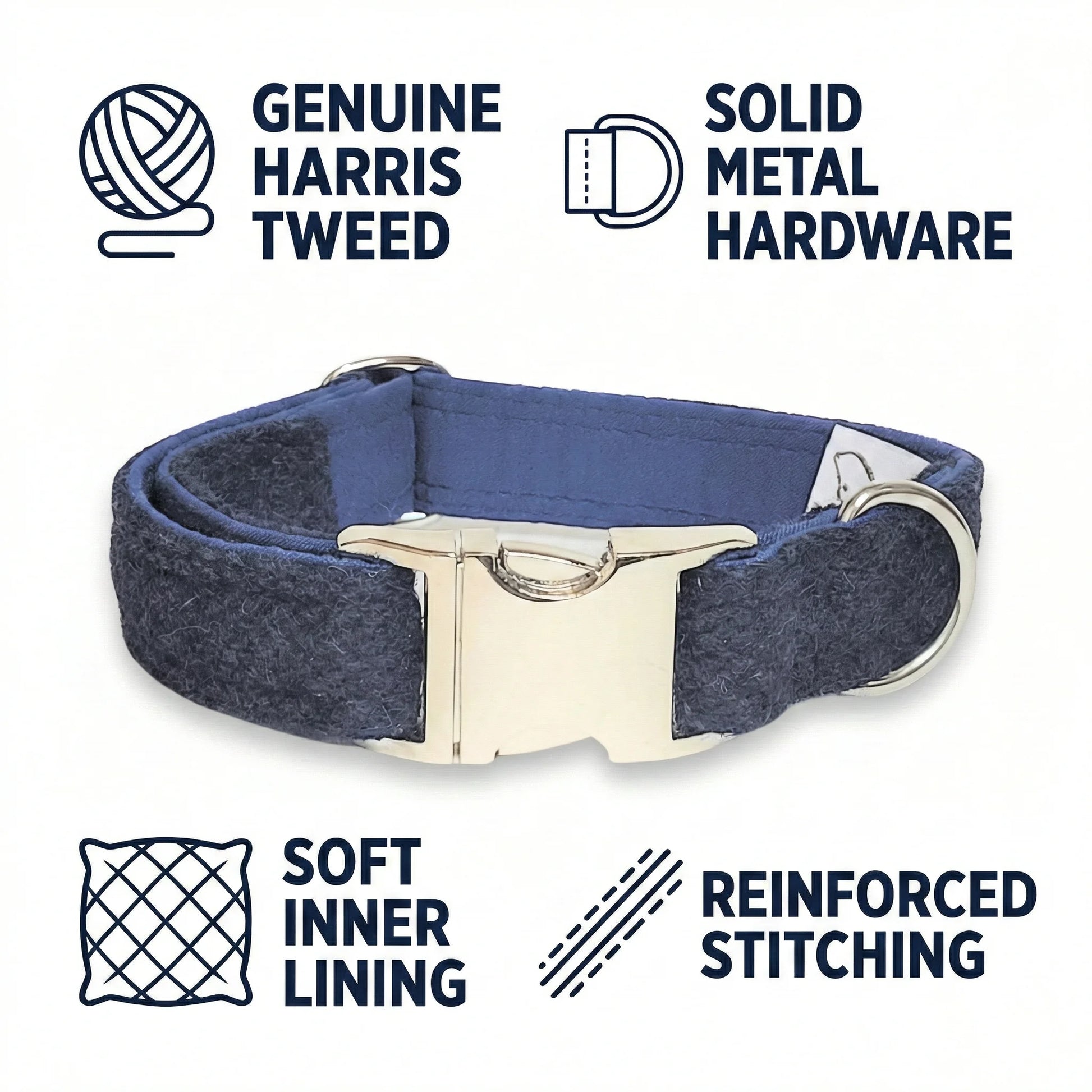 Classic style in deep midnight blue. The Midnight Blue Herringbone Harris Tweed clasp collar is handmade in Yorkshire, England from authentic Harris Tweed, woven in the Outer Hebrides of Scotland. A timeless herringbone weave paired with quick-release hardware makes this collar both elegant and practical for everyday use.