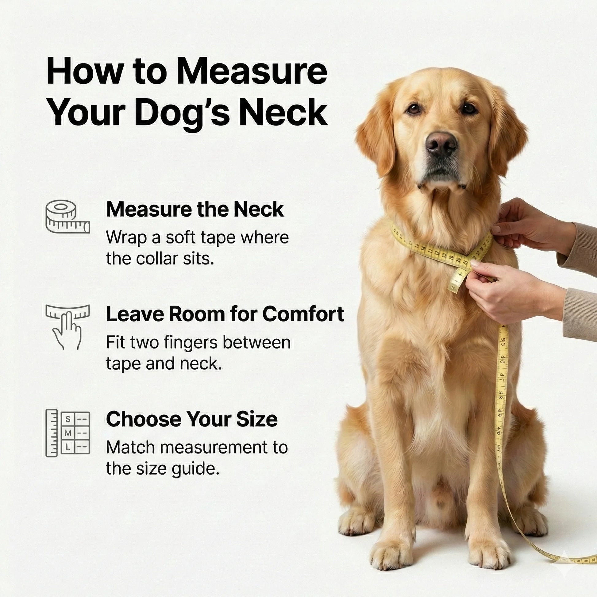 We recommend measuring around your dog’s neck where their collar would normally sit. Our collars are adjustable, but it’s important to pick the right base size. If you’re unsure, feel free to contact us — we’re happy to help you find the perfect fit.